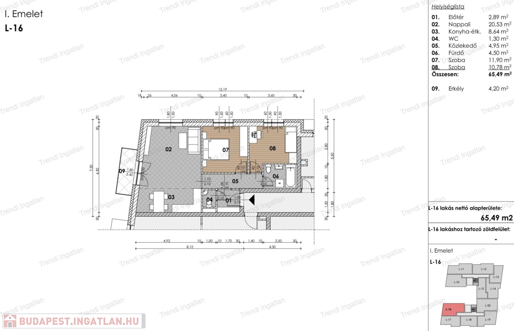 Az 1. emeleten található 65,49 m²-es lakásban amerikai konyhás nappali, 2 szoba, fürdőszoba, külön WC, közlekedő, előtér kerül kialakításra. Nappaliból 4,20 m²-es erkély nyílik.
