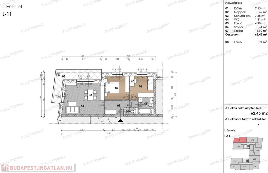 Az 1. emeleten található 62,45 m²-es lakásban amerikai konyhás nappali, 2 szoba, fürdőszoba, WC, közlekedő, előtér kerül kialakításra. Nappaliból 13,91 m²-es erkély nyílik.
