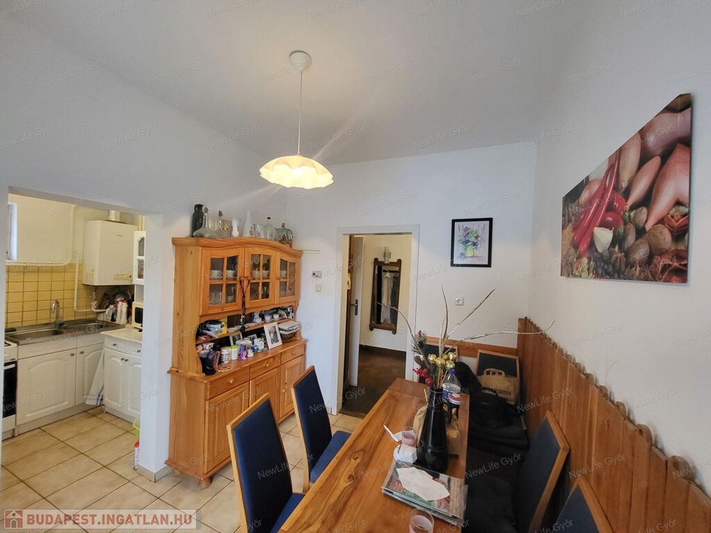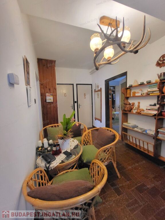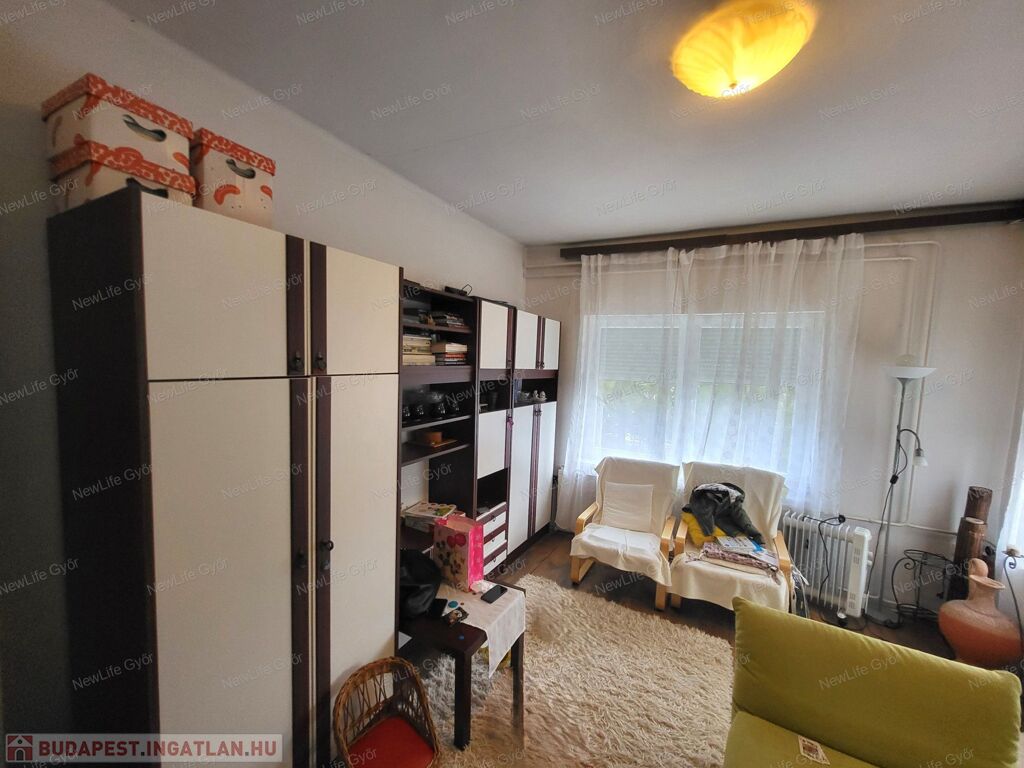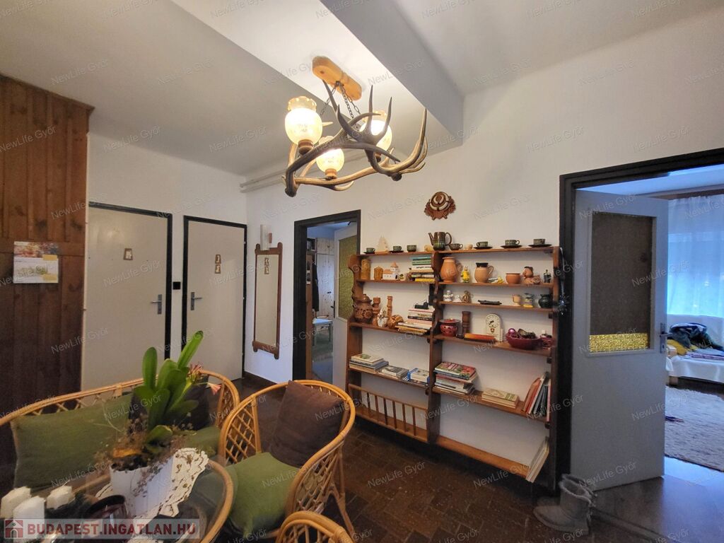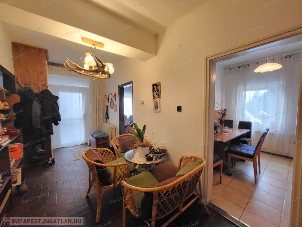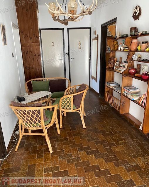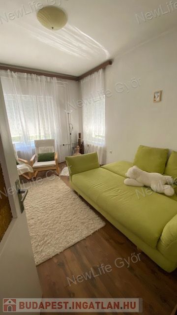 Győr–Ménfőcsanakon, frekventált, mégis nyugodt kertvárosi környezetben eladó egy kétlakásos társasház első emeleti, külön bejáratú lakása, amely valójában egy családi ház teljes felső szintjét jelenti, saját használatú kerttel és melléképületekkel.