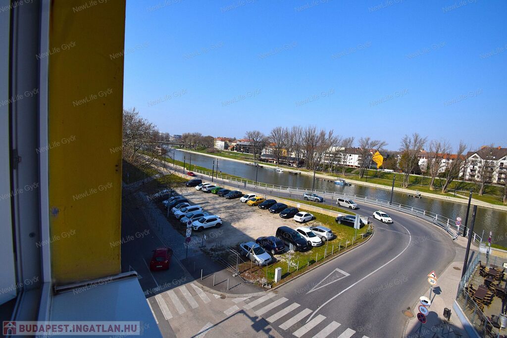 A nappali és konyha ablakból csodás kilátás nyílik a Mosoni-Dunára, ezen túl pedig üzletek, a belvárosi forgatag, Egyetem is szinte az ablakból látszik.