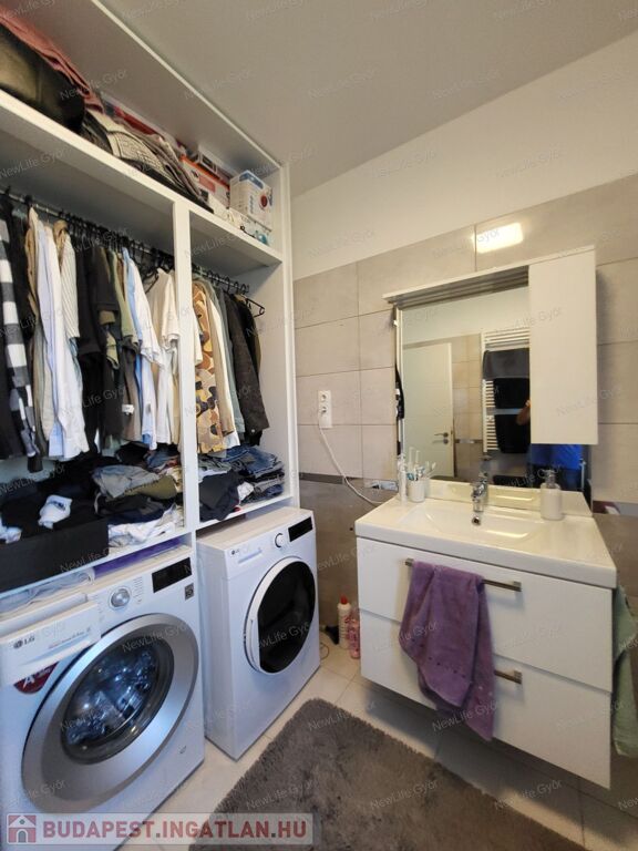 A fürdőszoba (8 m²) a modern lakások egyik mintapéldája – kád, üvegparaván, zuhanyzási lehetőség, mosó- és szárítógépnek kialakított hely, plusz extra beépített szekrények teszik tökéletessé.