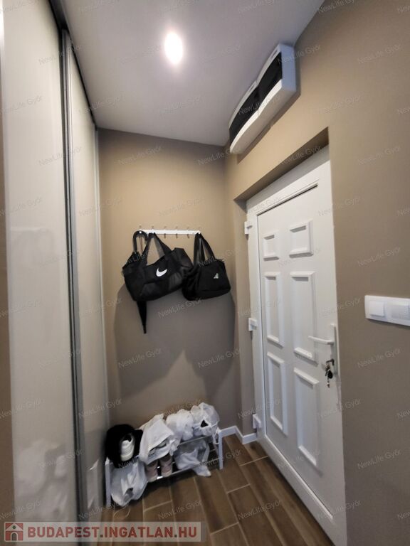 Az előszoba (3,5 m²) is maximálisan kihasznált, beépített szekrénnyel és akasztókkal.