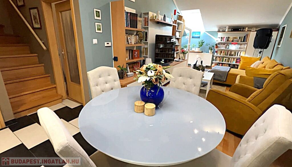 • Tökéletes elosztás: földszinten étkező-konyha-nappali, szoba, fürdő káddal, wc és egy terasz, ami a nappaliból és a szobából is elérhető