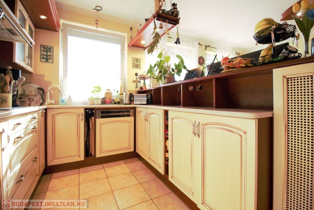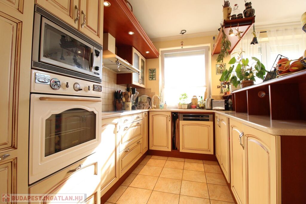 A konyha, egyedi tervezésű konyhabútorral és minőségi gépekkel.