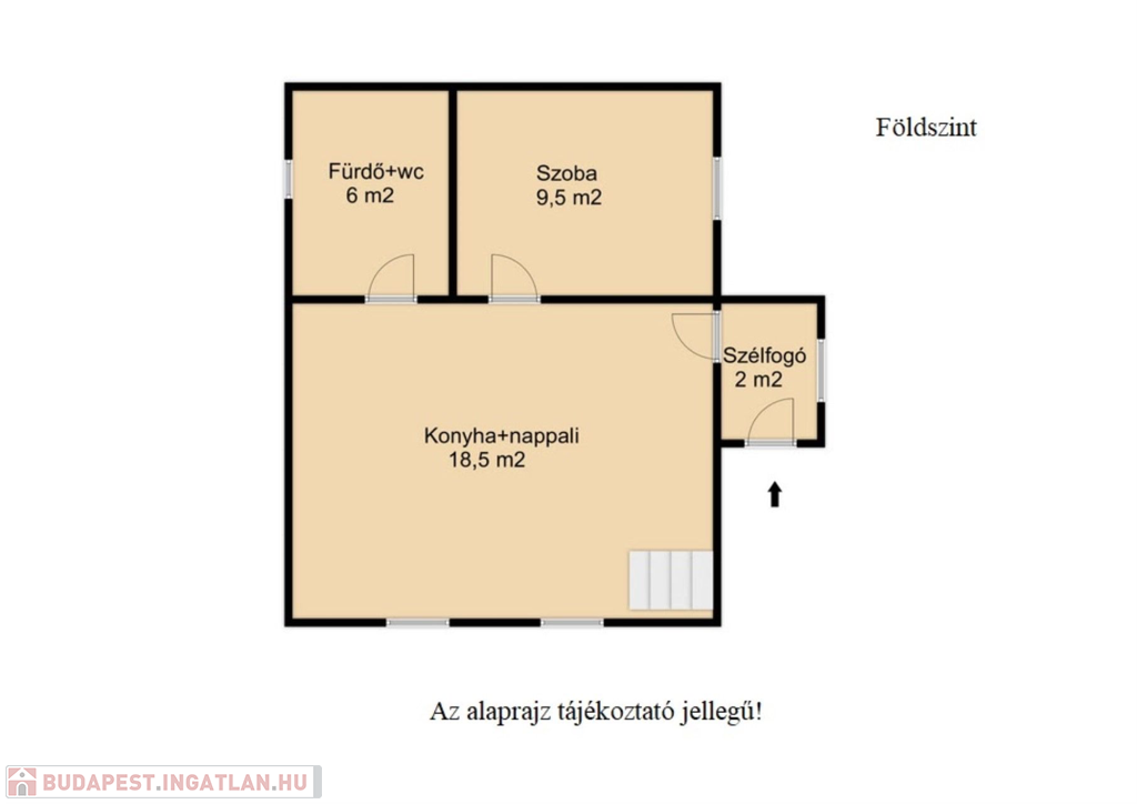 Az ingatlan két szintes, a földszinten a nappali és a konyha egy légtérben kapott helyet, emellett itt található a hálószoba és egy tágas fürdőszoba is. Az emeleti részen egy tároló és egy egy légterű szoba található.