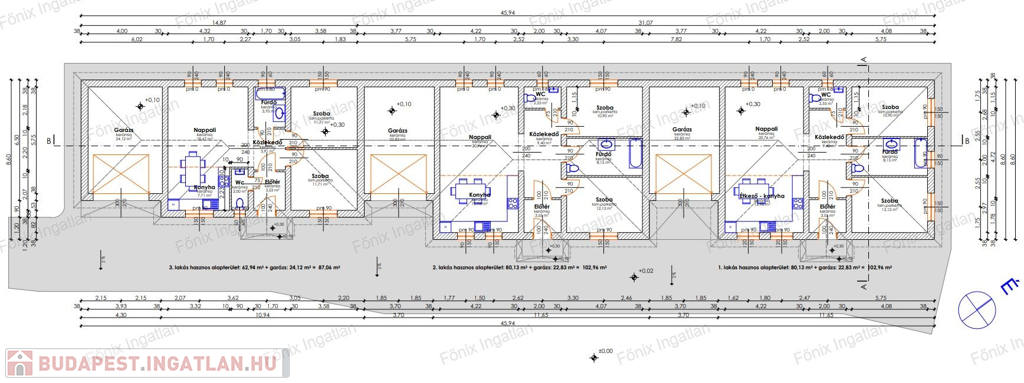 102,96 m² hasznos alapterület, ebből 80,13 m² lakótér – amerikai konyhás nappali, 2 hálószoba, 2 WC/fürdő, garázs, saját kert.