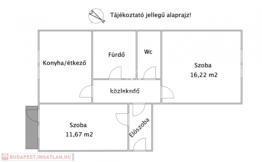 - 1 egész szobából, 1 félszobából, előszobából, konyhából/étkezőből, fürdőszobából, valamint WC-ből áll.