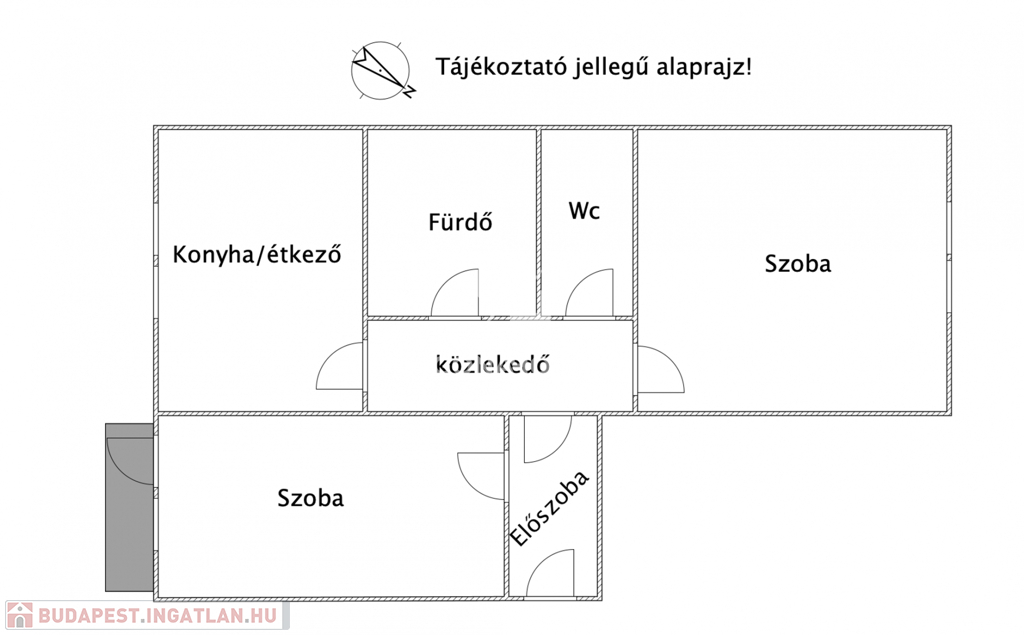 - 1 egész szobából, 1 félszobából, előszobából, konyhából/étkezőből, fürdőszobából, valamint WC-ből áll.