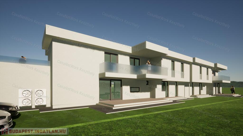alapterületű, kertkapcsolatos földszinti lakás, amely egy most épülő, lapostetős, hőszivattyúval ellátott, négylakásos társasházban található. Várható