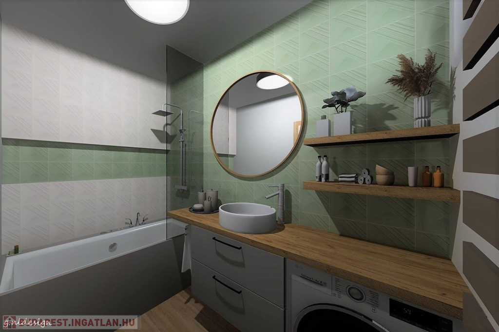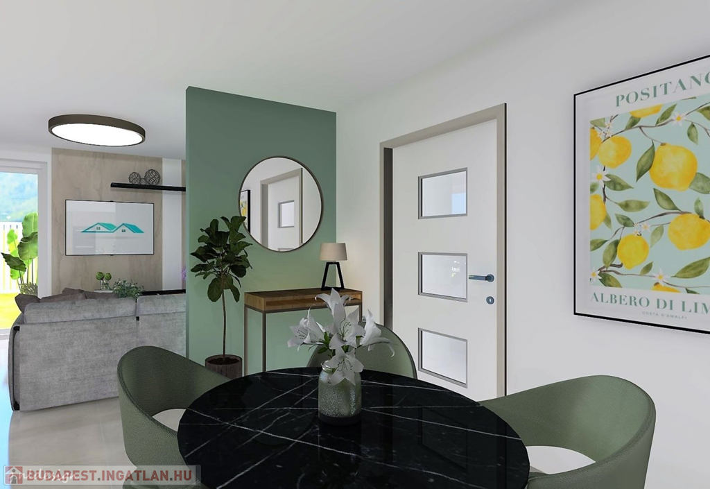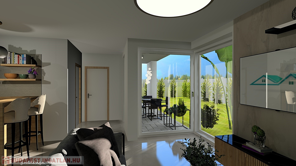 A lakás alapterülete összesen 55,93 m2, amelyhez egy 9,33 m2-es terasz tartozik. A lakáshoz tartozik még egy térkövezett, zárt udvari kocsibeálló is. A lakás helyiségei: hatalmas étkező-konyha, nappali, 1 hálószoba, fürdő, WC kézmosóval, előszoba.