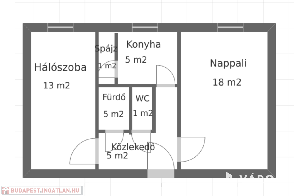 A lakás 1 nappaliból (18 m2), egy hálószobából (13 m2), közlekedőből (5 m2), konyhából (5 m2), spájzból (1 m2), WC-ből (1 m2) és fürdőszobából (5 m2) áll. Egyedi hőfokszabályzós radiátorokkal történik a fűtése távfűtéssel, igen kedvező számlákat produkálva.