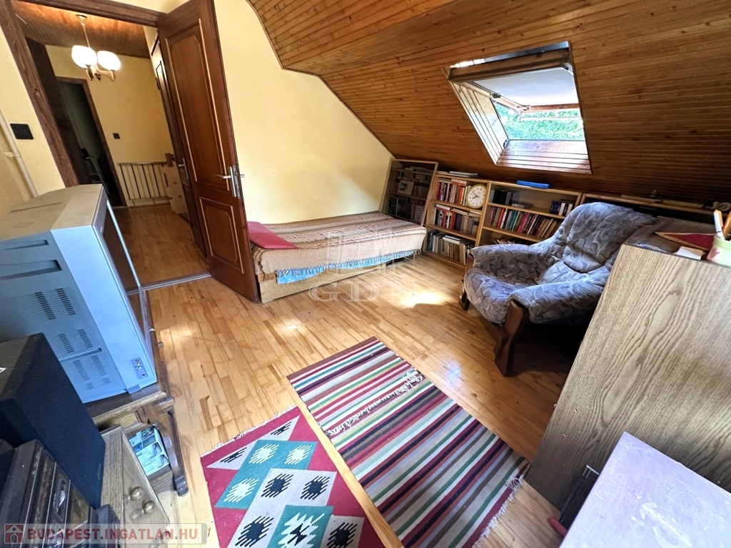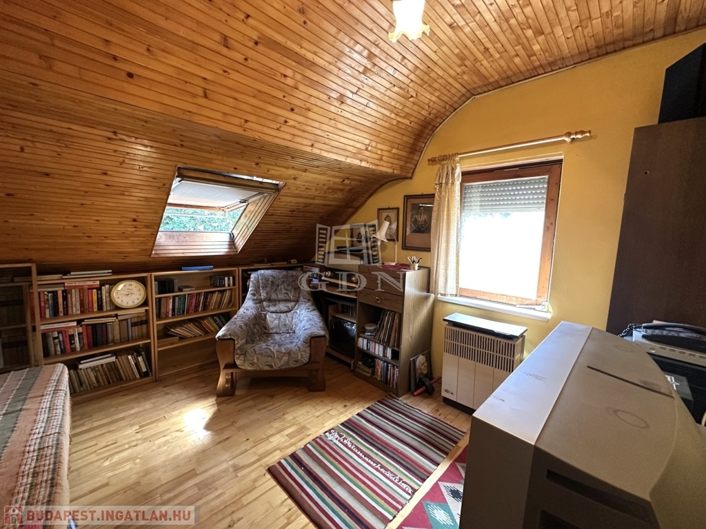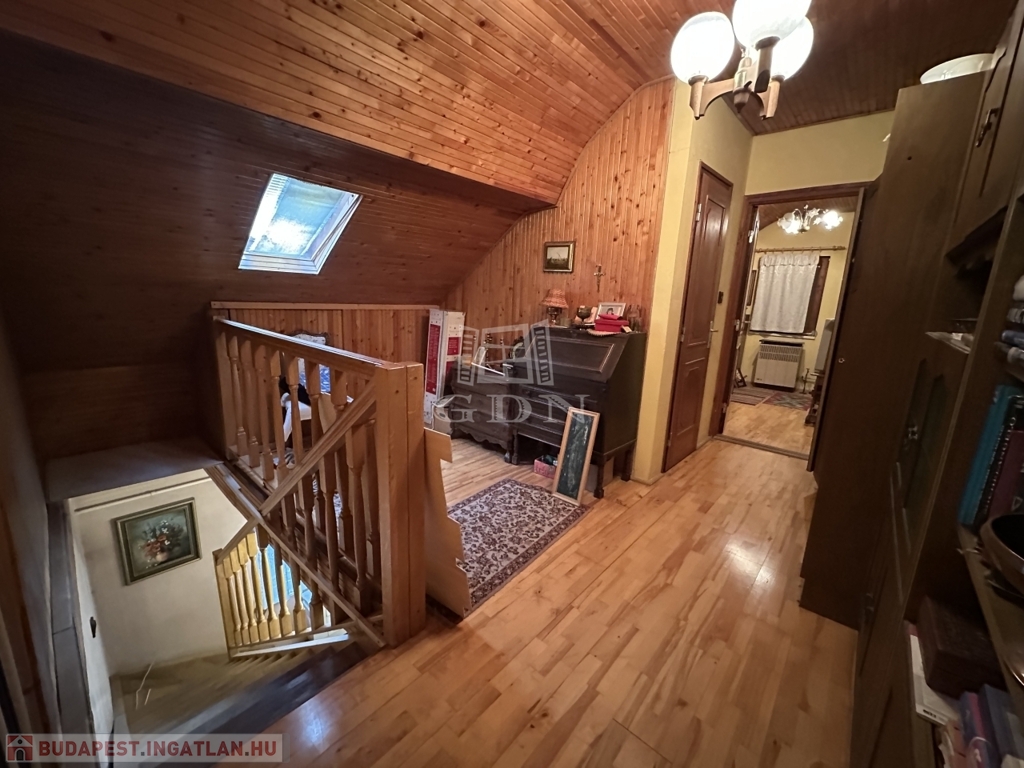 Az alsó, 52 m2-es szinten egy méretes gardróbos és tárolós előtér, konyha, kamra, fürdőszoba, nappali, valamint egy szoba, míg az ingatlan emeletén 2 szoba, egy dolgozó és egy mellékhelyiség került kialakításra.