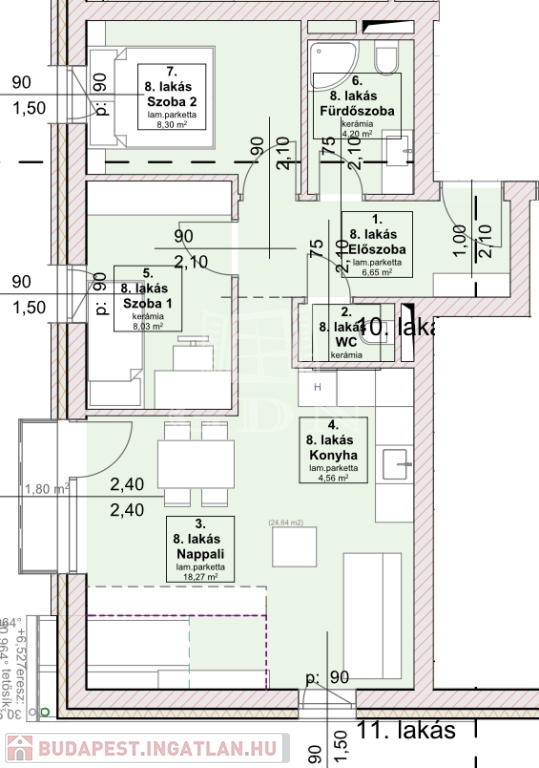 A B8 megjelölésű második emeleti lakás 51,4 m2 alapterületű. Az amerikai konyhás nappalin túl 2 szoba, fürdőszoba, mellékhelyiség, és előszoba kapott teret a lakásban. A közösségi térből közelíthető meg a 2 m2-es erkély.