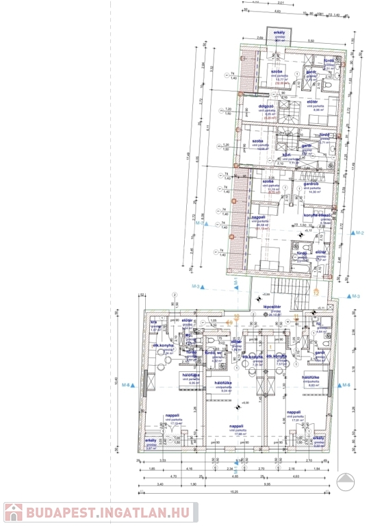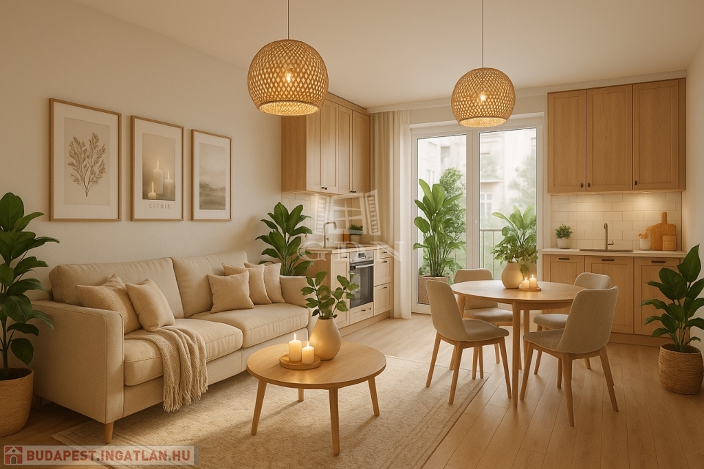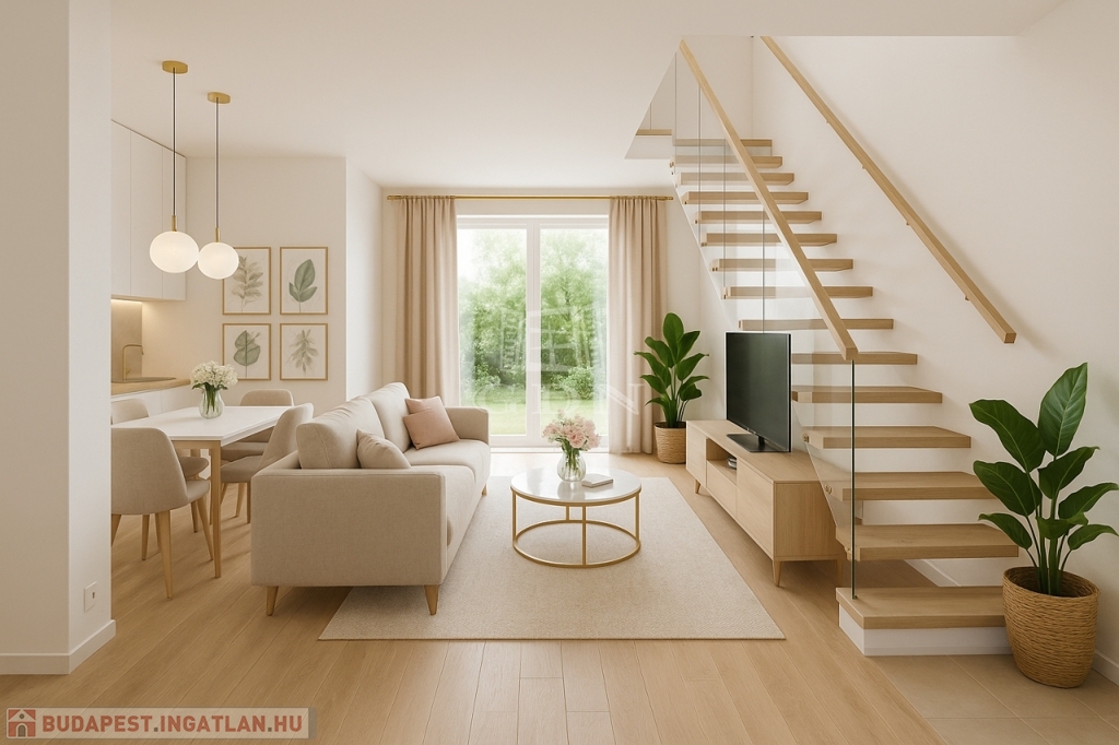 A lakásban az alsó szinten egy tágas közösségi tér (nappali-konyha-étkező), előtér és mellékhelyiség kerül kialakításra, míg a felső szinten két szoba, gardróbszoba és fürdőszoba kap teret. Igény esetén a lakásban egy további szoba is kialakítható. A lakás nappalijából egy méretes 17 m2-es erkély, míg a felső szinten az egyik szobából 3 m2-es erkély nyílik a zölddel borított udvarra.