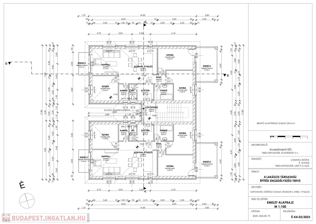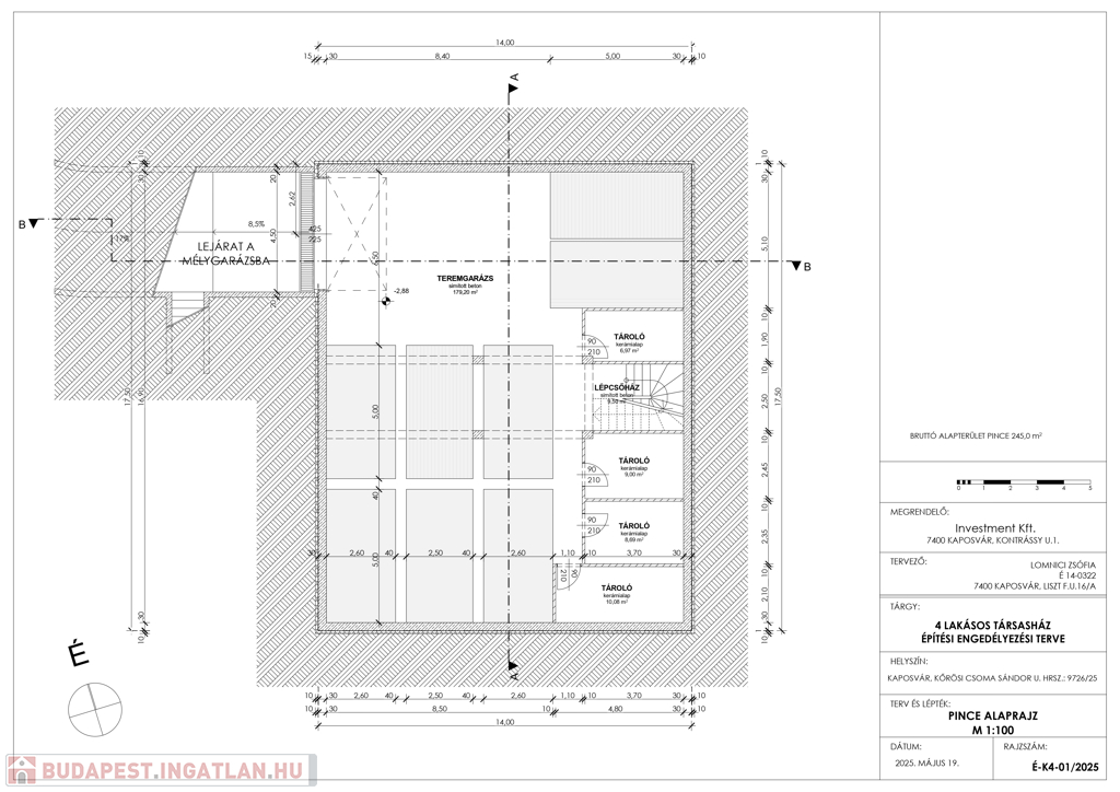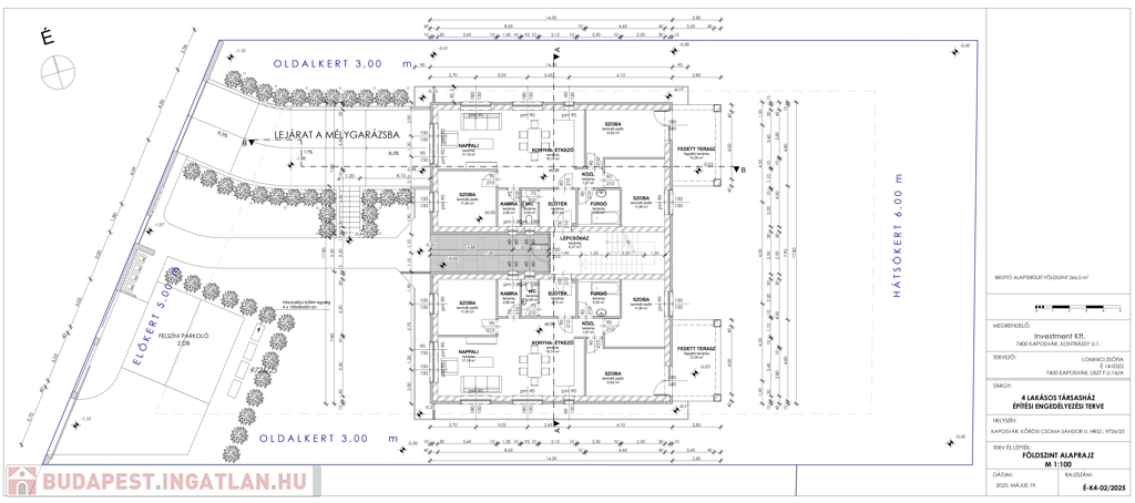 Kaposváron a Kecelhegyi városrészben, a Kőrösi Csoma Sándor utcában, új építésű, exkluzív - magas minőségben kivitelezett, korszerű építőanyagokból épülő, energiatakarékos társasházban - 4 db lakás eladó. A társasház földszintjén 2 db 97,91 m2-es lakás, míg az 1. emeleten 2 db 96,13 m2-es lakás kerül kialakításra. Minden lakásban előszoba, nappali - terasz vagy erkély - konyha, 3 szoba, fürdőszoba-wc helyiség lesz kialakítva, továbbá minden lakáshoz megvásárolható önálló tároló és egy felszíni parkoló, illetve a mélygarázsban 2 db beálló, elektromos autótöltővel. A kerítés kialakítása oly módon történik, hogy a felszíni parkolót kapunyitás nélkül is meg lehessen közelíteni. A korszerű, modern energetikájú - ezáltal alacsony rezsivel rendelkező - épület fűtése és hűtése levegő-víz hőszivattyúval lesz biztosítva, igény szerint napelemes támogatással, továbbá fan-coil rendszer szolgáltatja az igényelt hőmérsékletet a lakásban. A hőszigetelt faszerkezetű nyílászárókhoz igény szerint zsaluziák lesznek felszerelve, illetve prémium minőségű szaniterek és szerelvények, illetve csapok kerülnek beépítésre. A megállapodás szerint a konyhabútort (bútorlapból) igény esetén az eladó fogja legyártatni, amelyre a felek külön megállapodást kötnek. A lakáshoz tartozó önálló udvar mérete lakásonként 200 m2. A lakások az ideális lokáció miatt jó választás lehet családoknak és befektetőknek egyaránt - élelmiszerbolt, iskola, óvoda és buszmegálló gyalogos távolságban percek alatt elérhető. Az épület teljes kivitelezése és a műszaki átadása várhatóan 2026. IV. negyedévben történik meg.Energetikai besorolás: A