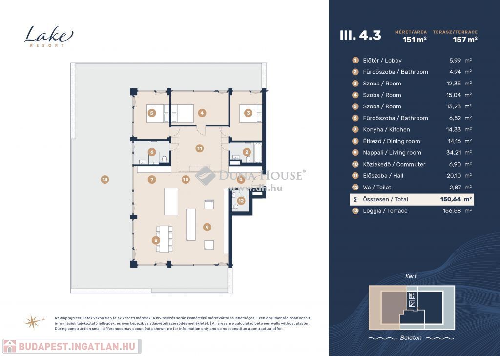 A Lake Resort lakópark Keszthely centrumától délre található Helikon ligetben, a Balaton nyugati oldalán, partközelségben természet közeli környezetben a volt Zala Kemping és Üdülőfalu területén helyezkedik el. Az ingatlan előtt húzódó Entz Géza sétány kerékpárútban végződik, ezáltal az ingatlan zárt szakaszon biztosítja a lakók személygépkocsival való bejutását. A 7,2 hektár nagyságú telek Balaton felőli oldalán ősfás parkosított szakasz nyúlik, a vízparton való pihenéshez, horgászathoz közvetlen móló vagy stég áll rendelkezésre. A déli oldalon húzódó zöld övezet a túrázni, sportolni vágyóknak és kis házi kedvencekkel való sétáláshoz ad tökéletes helyszínt. A tömb északi oldalán a Helikon Horgász Egyesület helyezkedik el.A Lake Resort, projektünk első ütemében 5, a második ütemben 7 házból álló 288 lakásos lakópark kerül kialakításra. A projekt első üteme 2022 első negyedévében kezdődött, kulcsrakész okos megoldással kialakított lakások műszaki átadása 2023 negyedik negyedévétől veszi kezdetét. A telek adta méreteinek és ősfás területének köszönhetően, gondozott parkok, játszó- és sport kertek, tanösvények, piknik/grillezéshez kialakított helyek, privát medencék és saját móló/stég nyújtanak felemelő kikapcsolódási élményeket. A területen megvalósuló Lake Resort lakópark a hely kiemelkedő adottságait kihasználva, könnyed, látványos építészeti megjelenésével harmonikus lakókörnyezetet teremt. Az épületek az Entz Géza sétány felől egy távirányítós rendszerrel ellátott sorompós behajtón, illetve személybejárón keresztül közelíthetőek meg. A lakóházak földszintjén fedett garázs, elektromos autótöltési lehetőség, zárt bicikli és egyéb tárolók találhatók. Az épületek aljában kereskedelmi és szolgáltatóegységek kerülnek kialakításra. A stúdió, közepes és deluxe méretű lakások elsőtől harmadik emeletig szintenként 7-7 lakással, saját erkéllyel lettek tervezve, a felső negyedik szinten pedig összesen három, két penthouse és egy közepes méretű lakás kap helyet privát teraszokkal. Lakásaink között elérhető 30 m2-től akár 150 m2-ig, melyek hozzájárulnak a minőségi életvitelhez és a gondtalan pihenéshez. A Lake Resort Lakópark négy szinten három különféle méretű lakást kínál az érdeklődők számára. Célunk, olyan lakások, otthonok és nyaralók kivitelezése, melyek erkéllyel/terasszal, klimatizált, prémium minőségű alapanyagokkal, modern 21. századi műszaki technológiával épülnek. Valamennyi lakáshoz földszinti fedett garázs és tároló is igény szerint vásárolható. Igényeihez igazodó lakását még ma találja meg, további kérdéseivel keressen bizalommal.