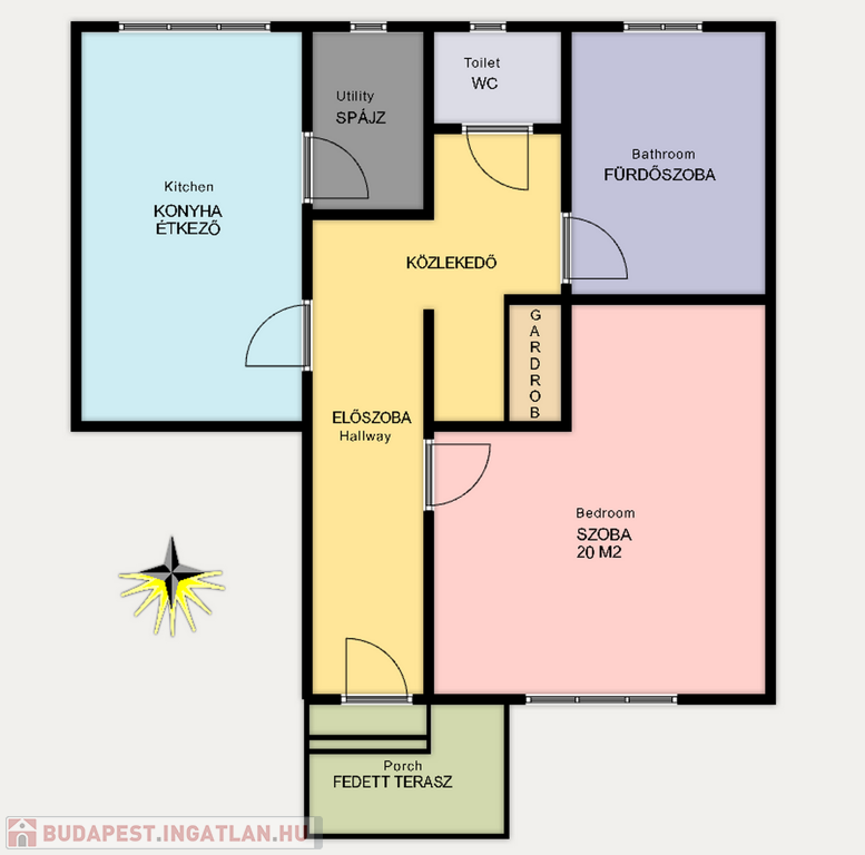 - Az 1960-as években épült társasházi ingatlanban kialakításra került 1 szoba, egy konyha étkezővel, spájz, fürdőszoba, külön wc, előszoba és egy fedett terasz.