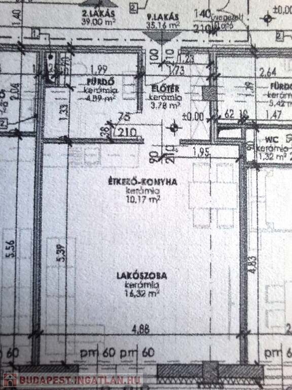 A lakás 35,16 nm, helyiségei:előtér 3,78 nm, fürdőszoba 4,89 nm, étkező/konyha 10,17 nm, nappali/lakószoba 16,32 nm.