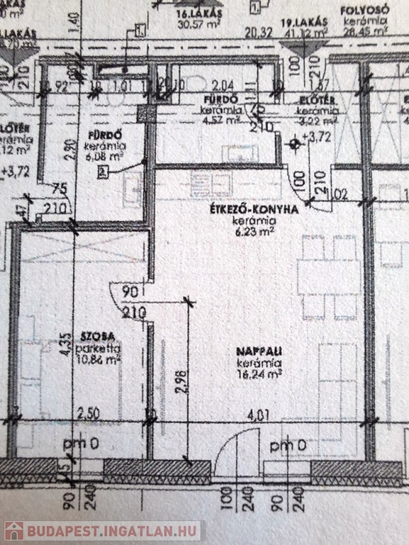 A lakás 41,12 nm, helyiségei:előtér 3,22 nm, fürdőszoba 4,52 nm, gardrób/szoba 10,84 nm, étkező/konyha 6,23 nm, nappali/lakószoba 16,24 nm.
