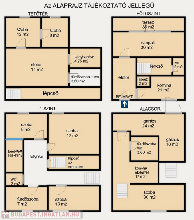 - Szobák (alagsor- 1 db, földszint- 1 nappali, első szint -3 db, tetőtér- 2 db)
