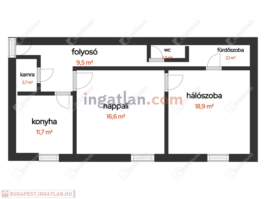 A lakás két tágas szobával, külön konyhával, fürdőszobával, külön WC-vel, kamrával, közlekedővel, rendelkezik.