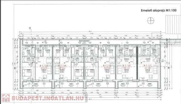 A B épületben a lakóegységek többsége nappali + 1 hálószobával rendelkezik, kb. 52 m2 alapterülettel. A földszinten terasszal, kertkapcsolattal, az emeleten loggiával. Ebben az épületben összesen 9 db lakás + tároló helyiség lesz.