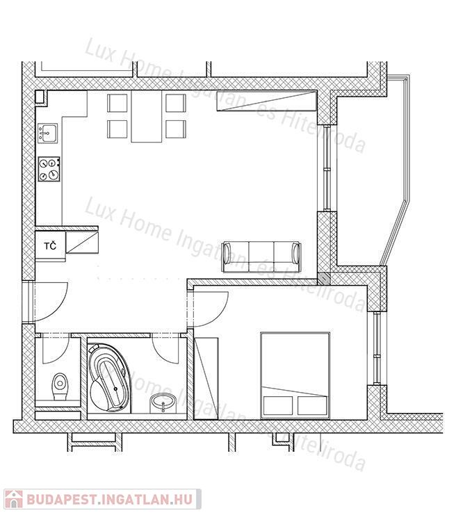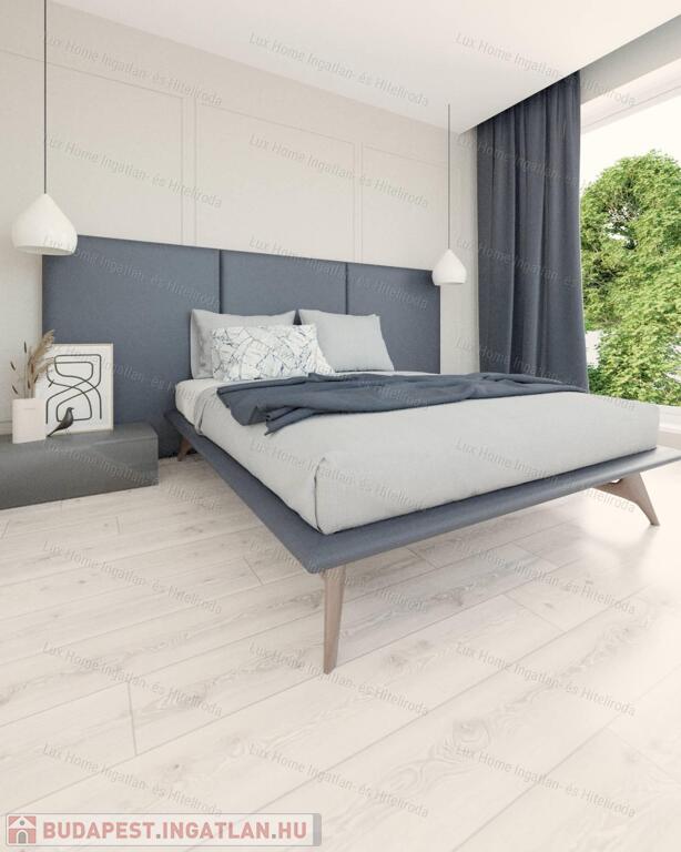 lett tervezve. A szoba laminált padlóval , a többi helyiség járólappal burkolt.