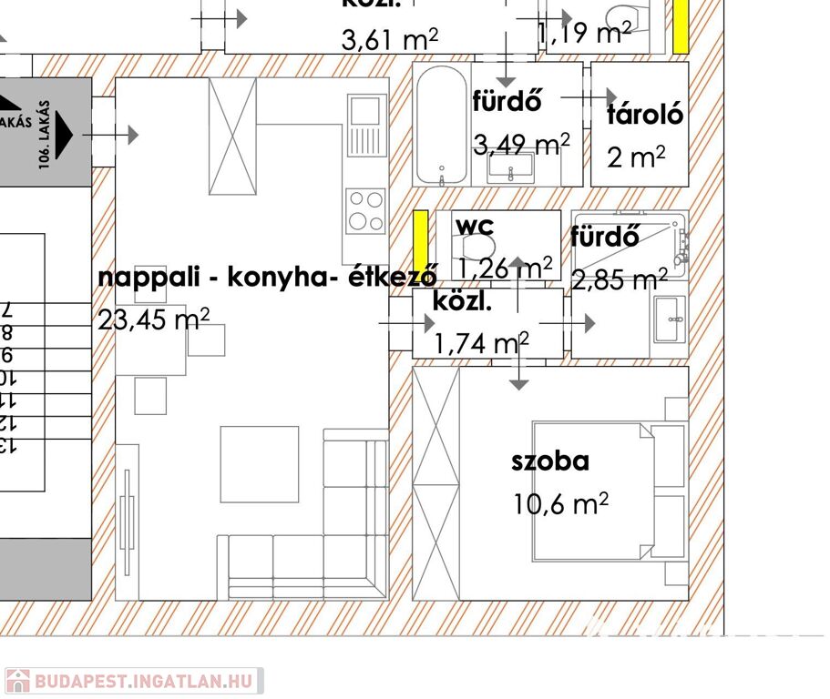 A 1 db amerikai konyhás nappalival, 1db hálószobával, 1 db fürdőszobával, közlekedővel, loggiával rendelkezik.