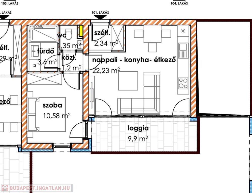 A 1 db amerikai konyhás nappalival, 1db hálószobával, 1 db fürdőszobával, közlekedővel, loggiával rendelkezik.