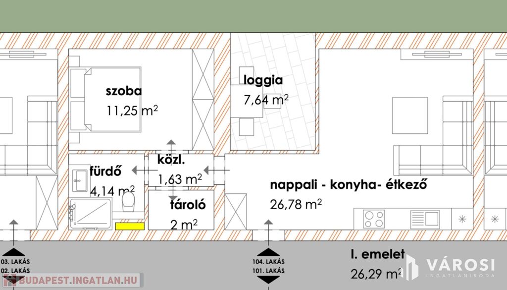A 1 db amerikai konyhás nappalival, 1db hálószobával, 1 db fürdőszobával, közlekedővel, loggiával rendelkezik.