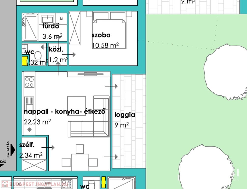 A 1 db amerikai konyhás nappalival, 1db hálószobával, 1 db fürdőszobával, közlekedővel, loggiával rendelkezik.