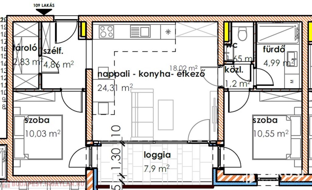 A 1 db amerikai konyhás nappalival, 2 db hálószobával, 1 db fürdőszobával, közlekedővel, loggiával rendelkezik.