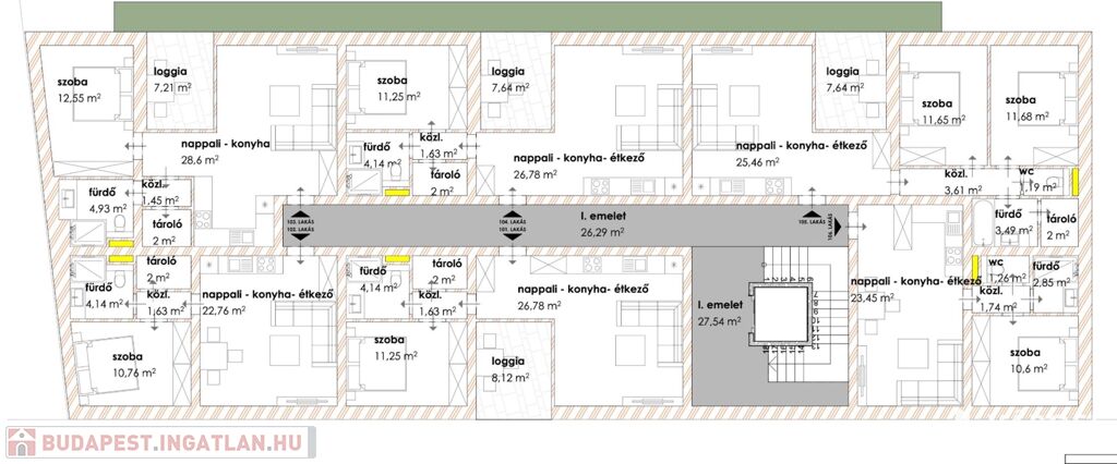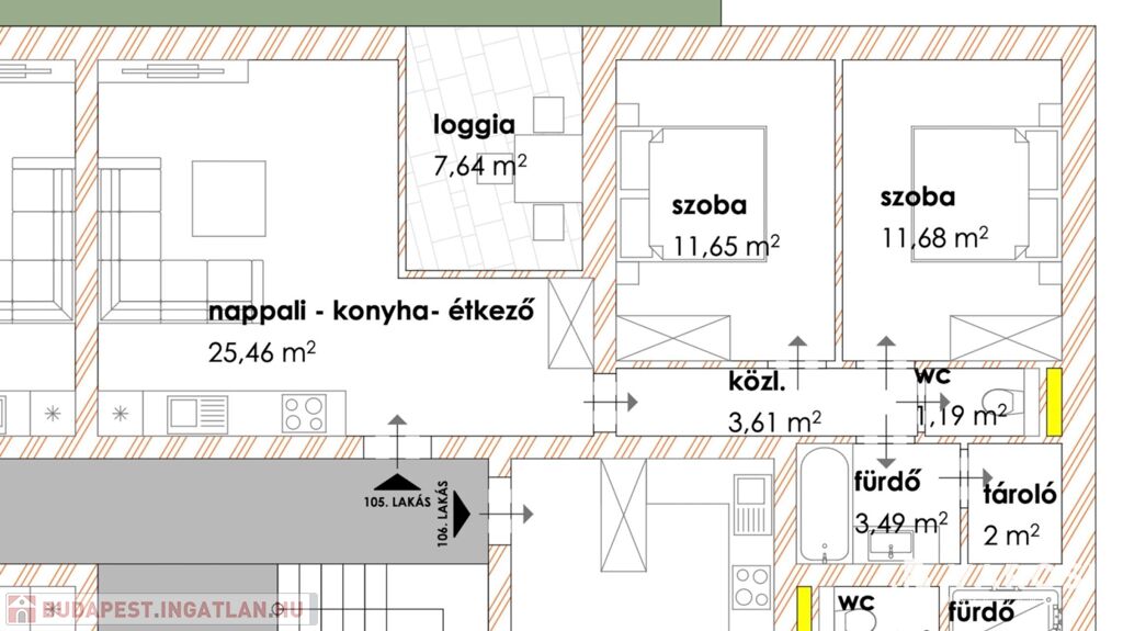 A 1 db amerikai konyhás nappalival, 2 db hálószobával, 1 db fürdőszobával, közlekedővel, loggiával rendelkezik.