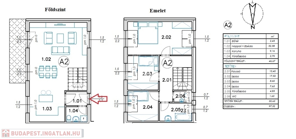 - a földszinten nappali, konyha-étkező, fürdőszoba-wc
