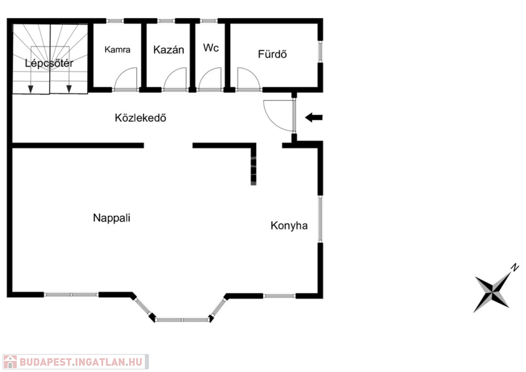 A földszinten egy tágas, amerikai konyhás nappali kapott helyet, amely a családi élet központja lehet. Innen nyílik egy praktikus kamra, valamint egy fürdőszoba, külön WC és háztartási helyiség, amelyek a mindennapi kényelmet szolgálják.
