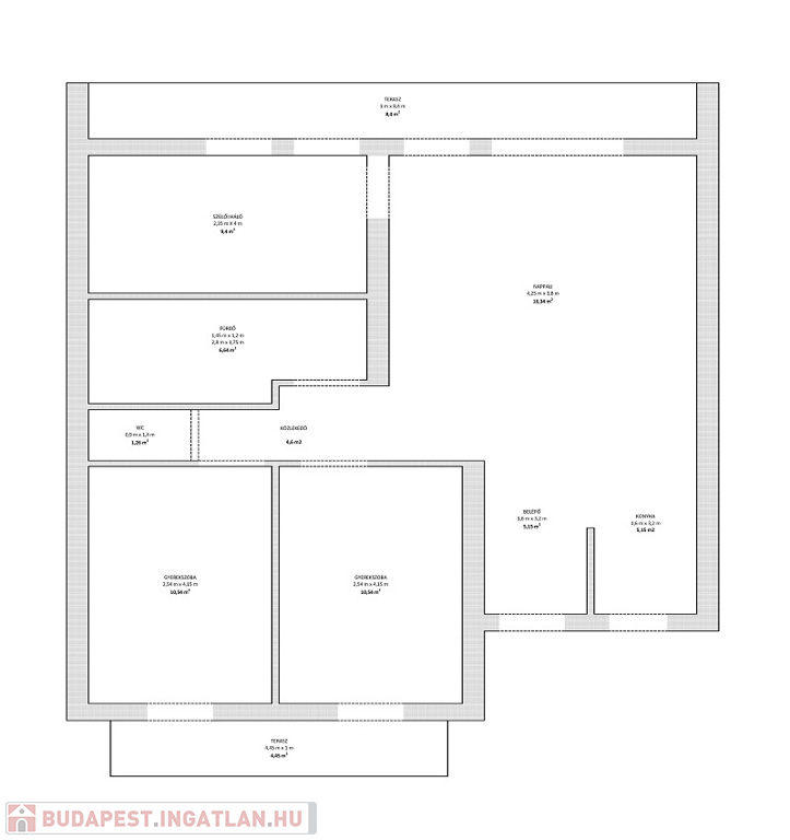 Az ingatlan lakóterülete 72 m2, melyben előszoba, konyha-étkező-nappali, közlekedő, 3 félszoba, fürdőszoba és WC található, valamint 2 db fedett terasz is tartozik a lakáshoz.
