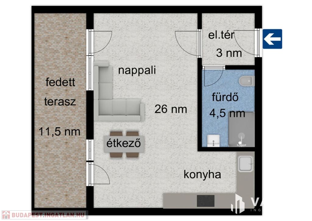 - Nappali, konyha-étkező, fürdő, előtér, fedett terasz.