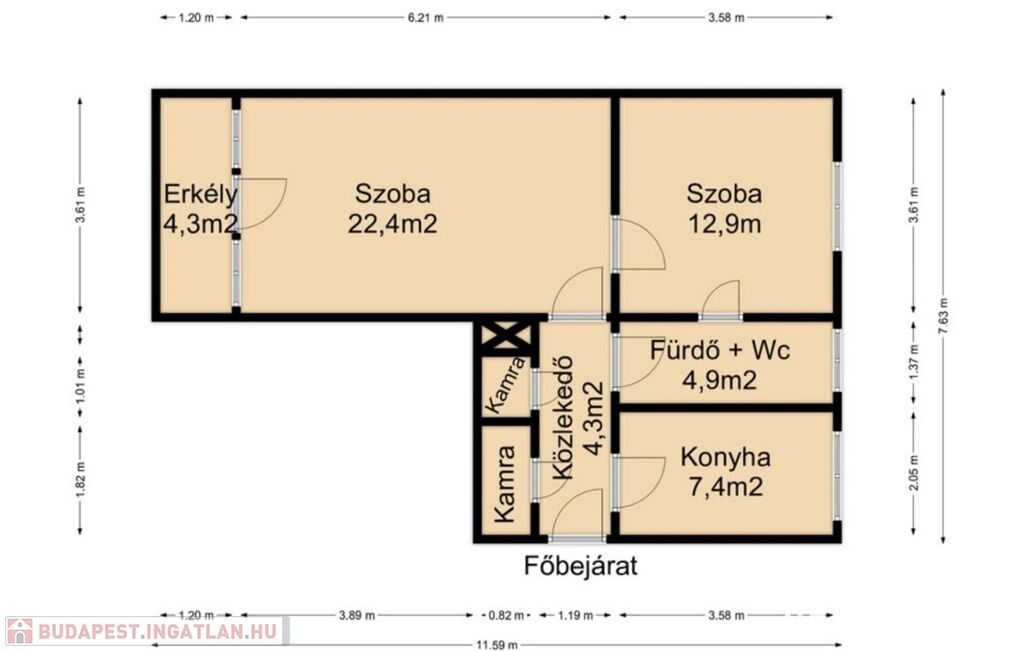 Belső lakrész helységei: nagyszoba erkélykapcsolattal, szoba, közlekedő, 2 kamra, konyha, fürdő mellékhelységgel együtt.