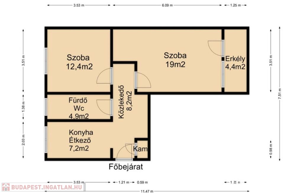 Belső lakrész helységei: 2 külön bejáratú szoba melyek közül a nagyszobához erkélykapcsolat is tartozik, közlekedő, konyha, kamra, fürdő mellékhelységgel együtt.