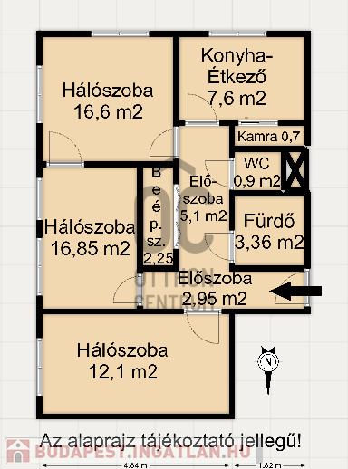 helyiségek: 3 hálószoba, melyek mindegyike külön nyílik, konyha-étkező, közlekedő, kamra, fürdőszoba, külön WC
