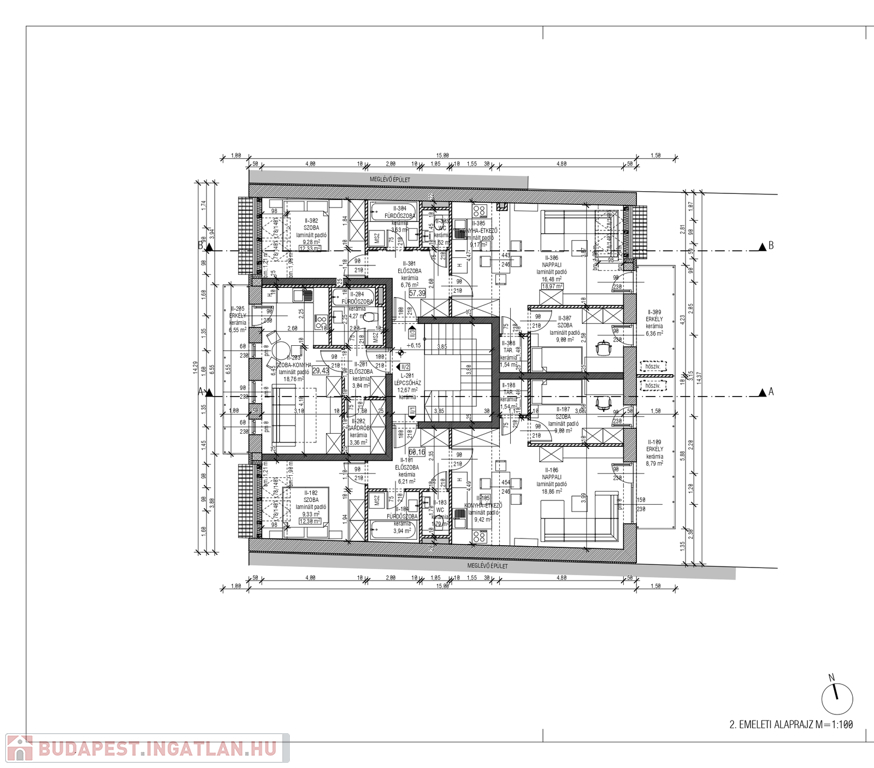 1/3 lakás: 62,91 m2, nappali + 2 szoba, tároló, erkély (6,05 m²), terasz (4,05 m²). Egyedi gázfűtés, padló fűtés. Ára: 68.200.000 Ft
