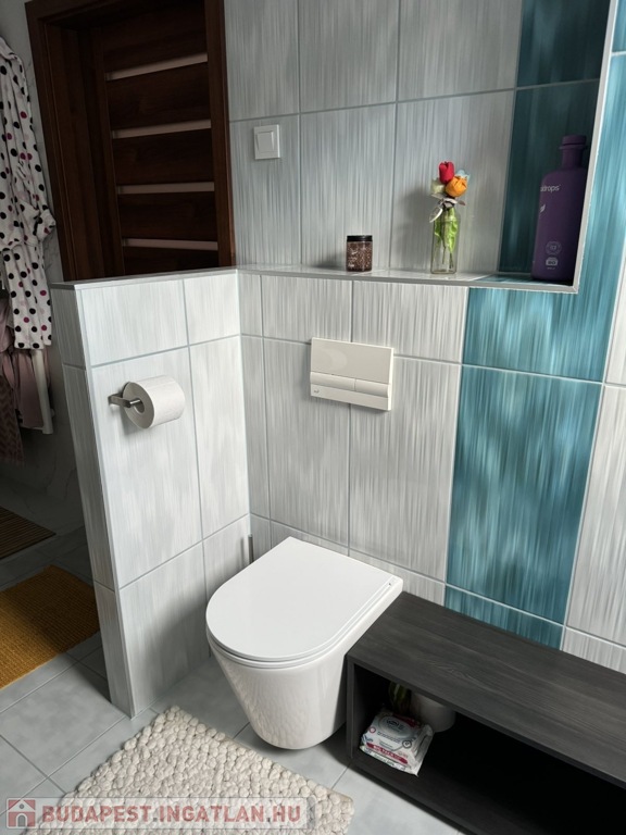 Az alsó szinten amerikai konyhás nappali található, egy külön nyíló szobával, tágas fürdőszobával, külön WC-vel, valamint egy praktikusan kialakított dolgozósarokkal. Az egyedi tervezésű, prémium minőségű belső lépcső nemcsak esztétikai elem, hanem a lakás karakterének egyik meghatározó része.