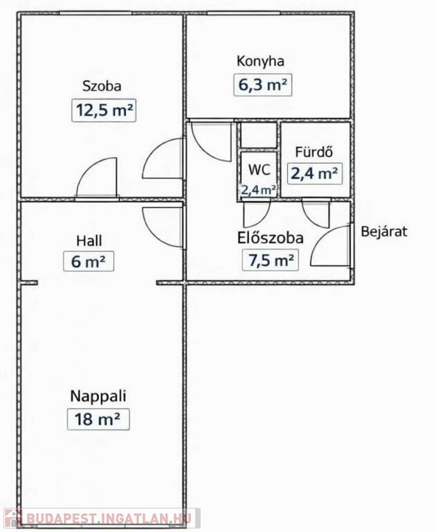 Elosztása praktikus és élhető: tágas nappali + hall (~24 m²) hálószoba (~12,5 m²) konyha (~ 6,3 m²) fürdő (~ 2,5 m²) WC (~ 1 m²) előszoba (~ 7,5 m²) Összesen: ~ 53 m²