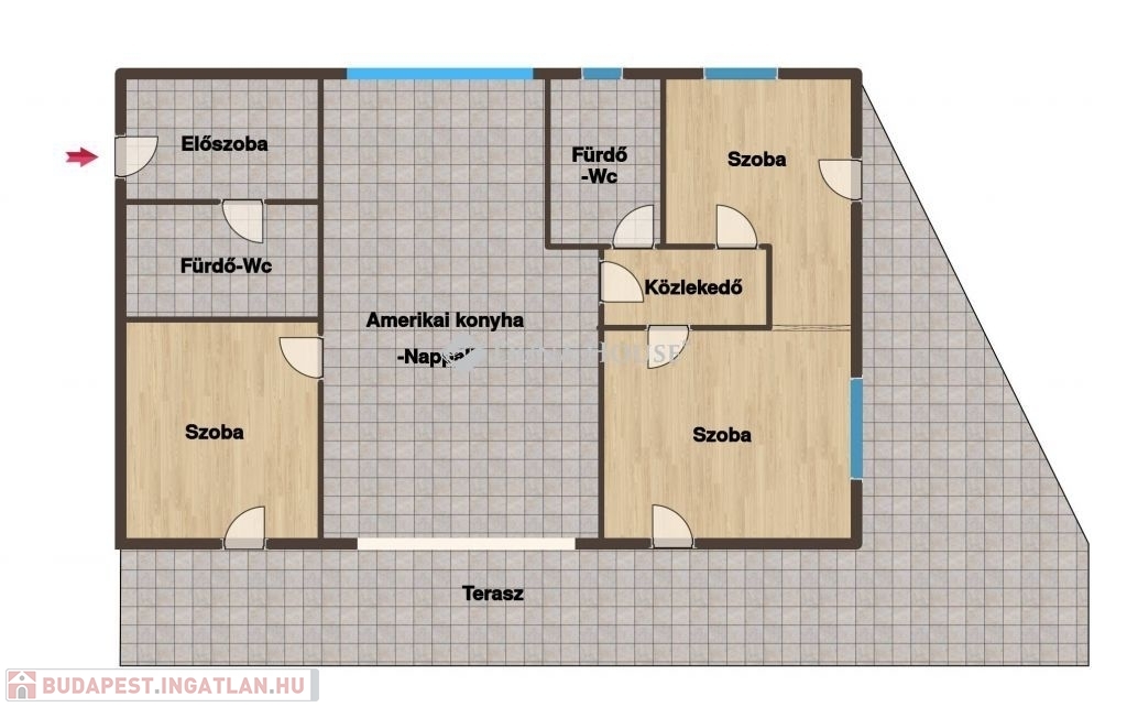 89 m2 alapterületű lakás, amerikai konyha-nappali+ 3 hálószoba+ 2 fürdőszoba elosztással