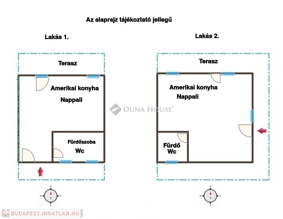 Mindkét lakás: amerikai konyhás nappali + fürdőszoba WC-vel + terasz