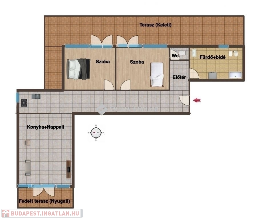 Előtér, 2 külön nyíló szoba, amerikai konyhás nappali, fürdőszoba, külön WC, valamint két fedett terasz, ahonnan gyönyörű panoráma nyílik a TV-toronyra.