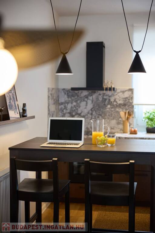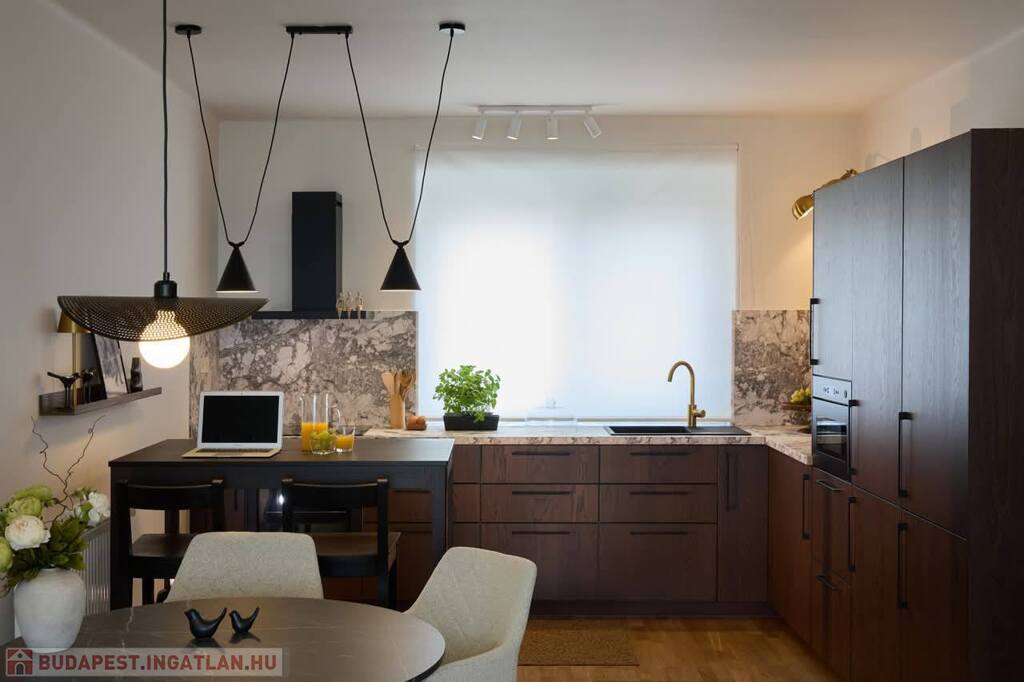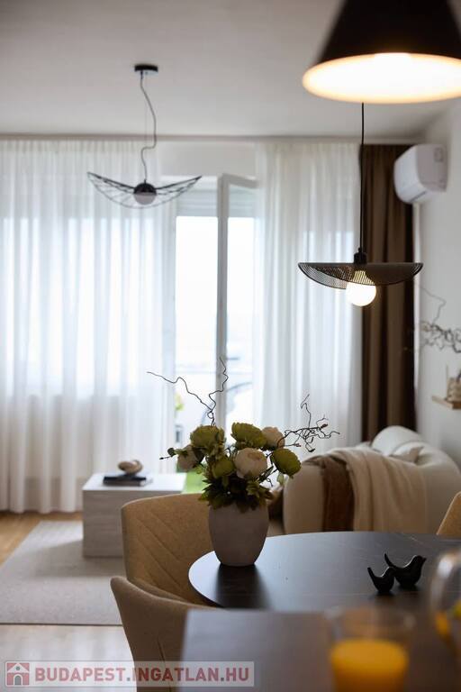 -amerikai konyhás tágas, napfényes nappali, konyhapult teljesen gépesített, indukciós főzőlappal, sütő, mikrohullámú sütő, páraelszívó, hűtő, mosogatógép, kombinált mosó-szárítógép