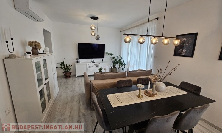 Kertkapcsolat és extra területek. A lakáshoz tartozik egy 240 m²-es kizárólagos használatú, parkosított kert, benne egy könnyűszerkezetes, 10 m²-es kisházzal ideális tárolónak vagy hobbihelyiségnek. Két kényelmes terasz, mindkettő beépített, kinyitható árnyékolóval. A kertből kiskapun keresztül is eljuthatunk a két autóbeállóhoz, melyek közvetlenül a lakás előtt helyezkednek el. Belső elrendezés 3 hálószoba Tágas nappali-konyha-étkező egy légtérben 2 igényes fürdőszobaPrémium felszereltség FAP olasz hidegburkolatok Hansgrohe falba süllyesztett csaptelepek Blanco gránit mosogató és csaptelep a konyhában Minőségi német konyhabútor kompakt munkapulttal, konyhaszigettel Új, elektromos fehér alumínium redőnyök minden ablakon Hőszivattyús padlófűtés + fancoil hűtés a kellemes klímáért egész évben Alacsony rezsiköltségek, energiahatékony, és letisztult, igényes belső terek.