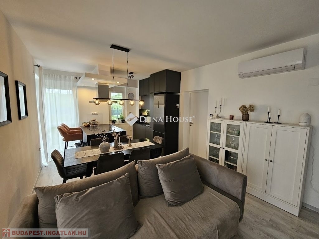 Eladó újszerű kertvárosi lakás, saját parkosított kertkapcsolattal!!!!!Pécs egyik csendes, zöldövezeti részén kínálunk megvételre egy 2023-ban átadott 92 m²-es földszinti lakást, amely minden igényt kielégítő belső kialakítással és kivételes külső adottságokkal rendelkezik.Kertkapcsolat és extra területekA lakáshoz tartozik egy 240 m²-es kizárólagos használatú, parkosított kert, benne egy könnyűszerkezetes, 10 m²-es kisházzal – ideális tárolónak vagy hobbihelyiségnek.Két kényelmes terasz, mindkettő beépített, kinyitható árnyékolóval.A kertből kiskapun keresztül is eljuthatunk a két autóbeállóhoz, melyek közvetlenül a lakás előtt helyezkednek el.Belső elrendezés 3 hálószoba Tágas nappali-konyha-étkező egy légtérben 2 igényes fürdőszobaPrémium felszereltség FAP olasz hidegburkolatok Hansgrohe falba süllyesztett csaptelepek Blanco gránit mosogató és csaptelep a konyhában Minőségi német konyhabútor kompakt munkapulttal, konyhaszigettel Új, elektromos fehér alumínium redőnyök minden ablakon Hőszivattyús padlófűtés + fancoil hűtés a kellemes klímáért egész évben Alacsony rezsiköltségek, energiahatékony, és letisztult, igényes belső terek.Elhelyezkedés szempontjából is ideális:A belváros autóval mindössze 7 perc, de a tömegközlekedés is kiváló. A mindennapi ügyintézéshez szükséges szolgáltatások csupán egy percre találhatók: Tesco, Rossmann, gyógyszertár, minden gyalogosan is gyorsan elérhető.