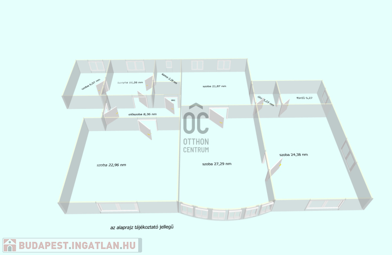 Helyiségek: 4 egész szoba, 1 félszoba, előszoba, konyha, fürdőszoba+wc, külön wc, kamra